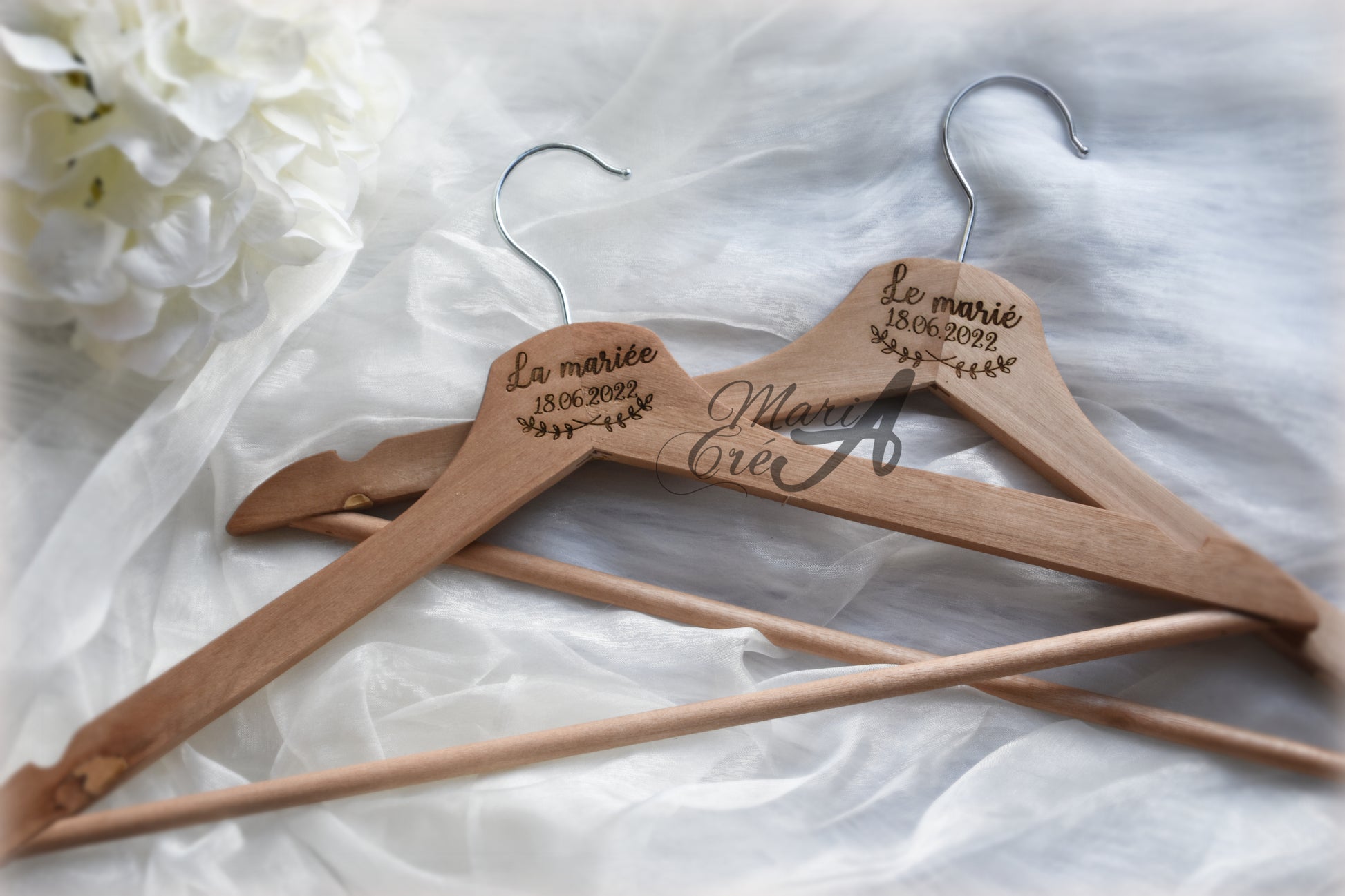 De jolis cintres en bois gravés avec la date de votre mariage pour y suspendre les tenues du jour J, de belles photos à faire avant l'habillage. Vous pourrez par la suite suspendre joliment votre tenue sur ces cintres.
