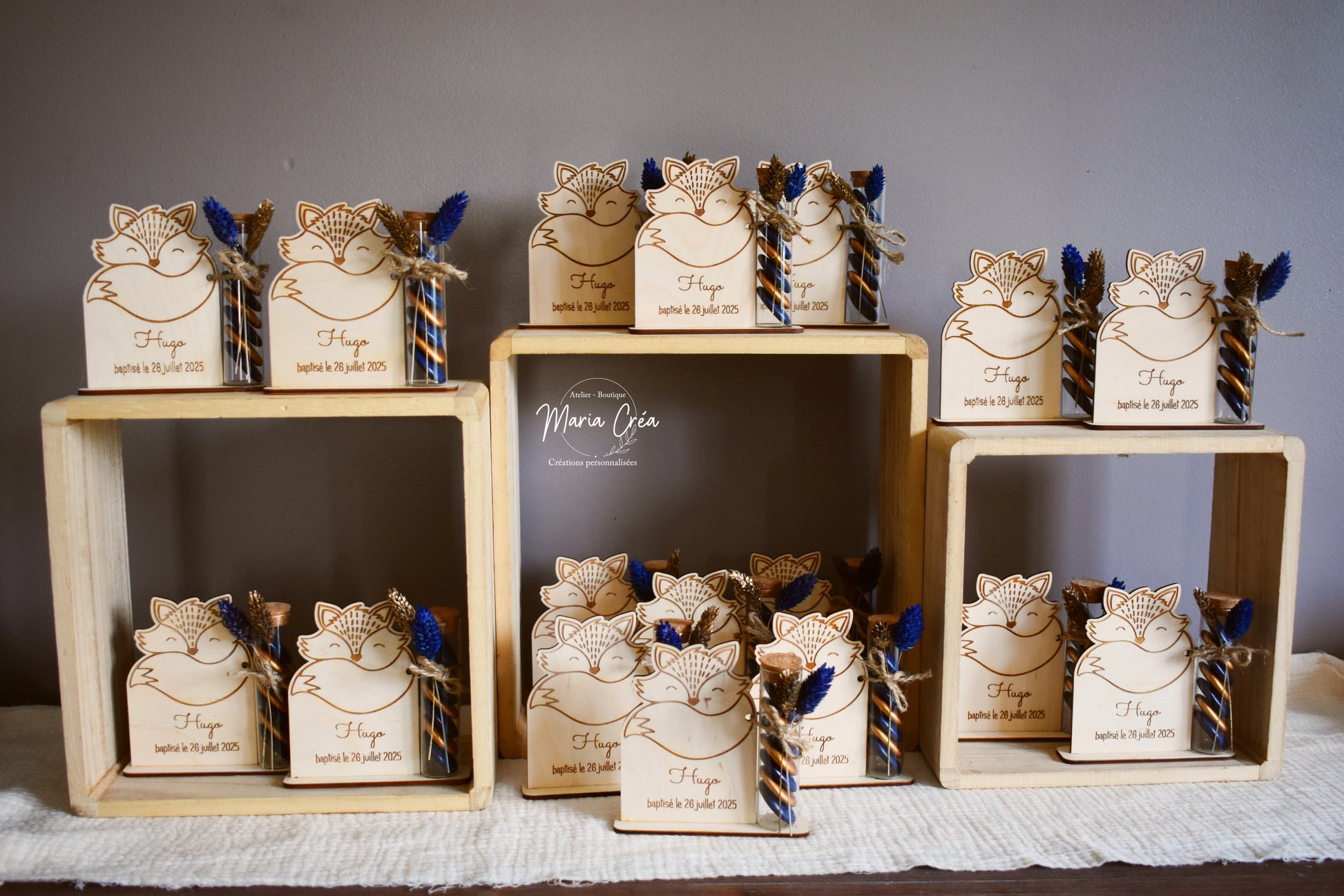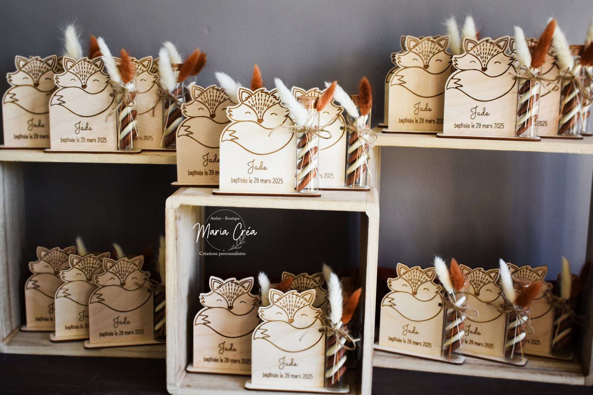 Pour célébrer les moments magiques de la vie : nos remerciements en bois, des cadeaux d'invités pour les baptêmes, communions, mariages ! Nous pouvons garnir les petites fioles de dragées, fleurs séchées,... Aussi possible en grand format ou en cadre pour les cadeaux parrain/marraine/parents/grands-parents.