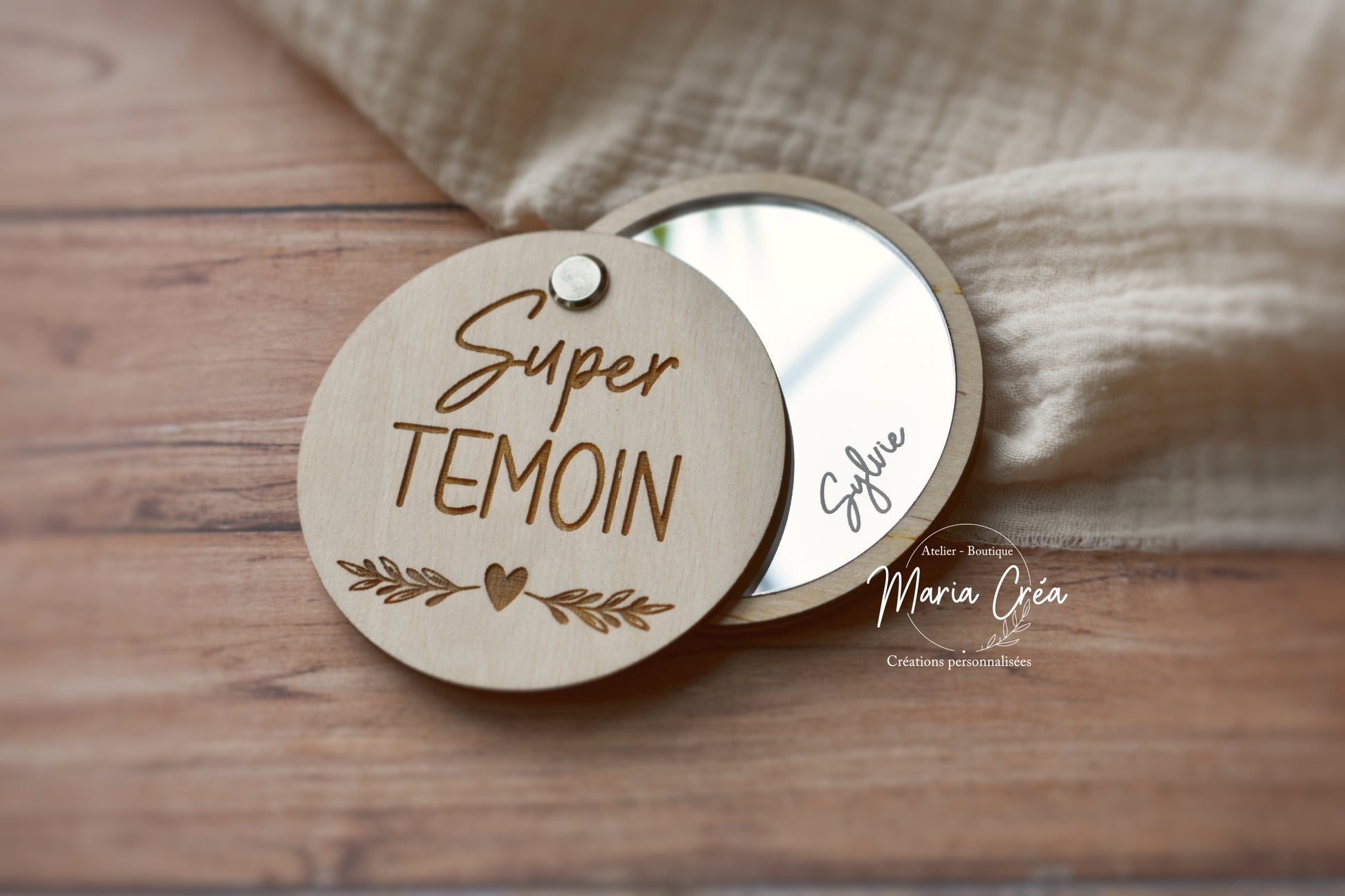 Un joli miroir de poche personnalisé avec l’inscription de votre choix, idéal pour faire plaisir à votre témoin de mariage.