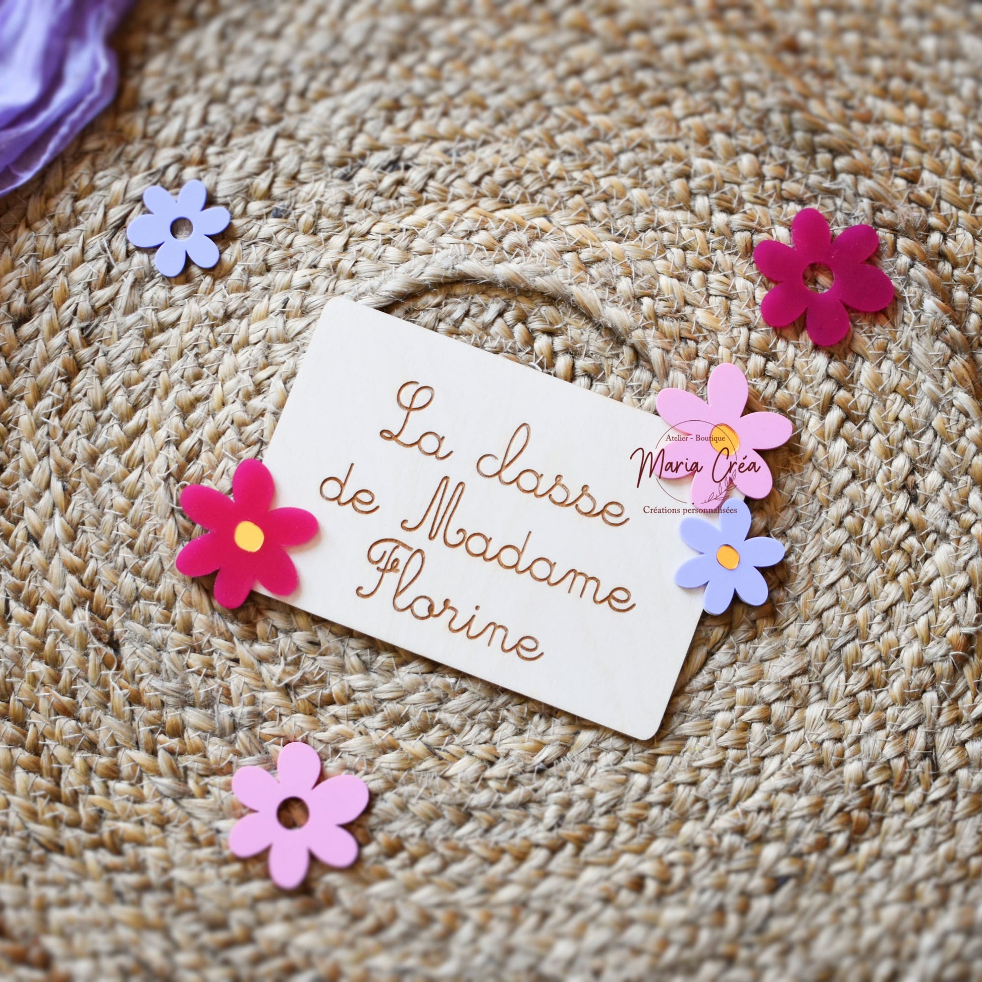 Une jolie plaque de porte en bois, décorée de fleurs dans des tons délicats (rose clair, fuchsia et mauve), parfaite pour embellir la classe d’une institutrice avec douceur et élégance.