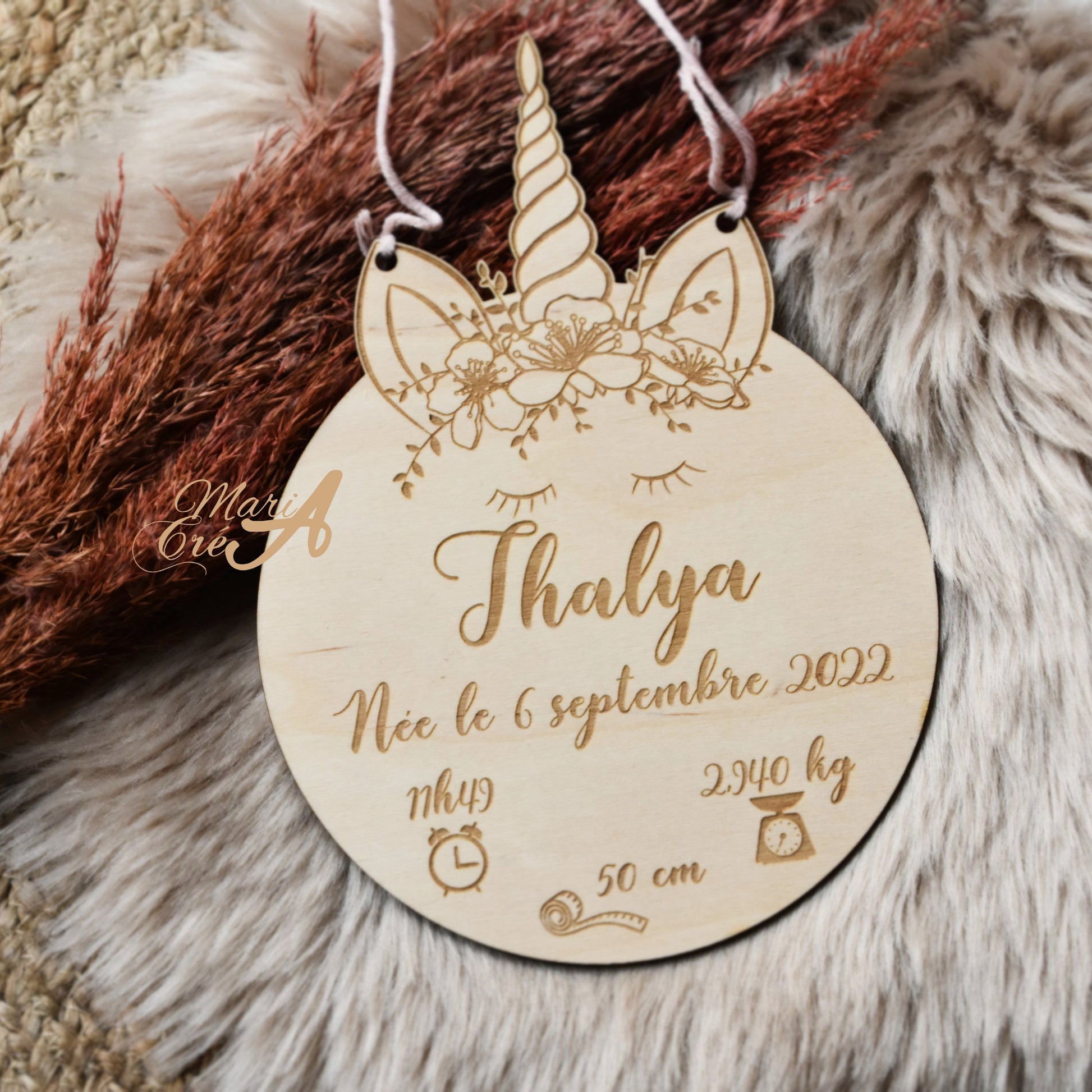 Une plaque en bois licorne gravée avec les informations de naissance de l'enfant. Une idée très mignonne et originale de cadeau. Cette plaque peut ensuite être utilisée comme décoration de porte ou dans la chambre de bébé.