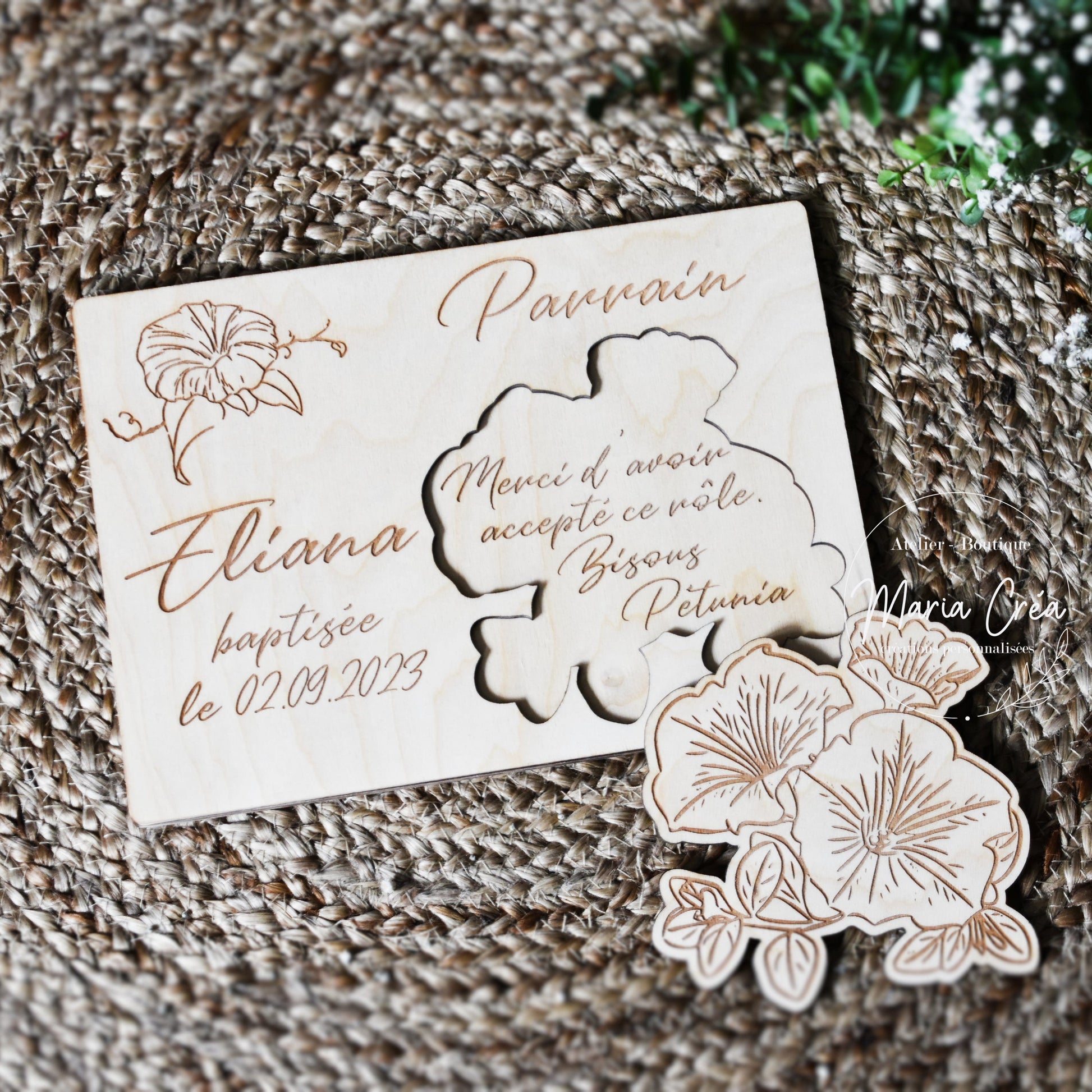 La plaque est personnalisable avec le prénom et la date de baptême de votre enfant, ainsi qu'une petite citation ou message en rapport avec l'événement. Ils pourront la conserver en souvenir de ce jour spécial, tout en ayant un objet décoratif pour leur maison. Vous pouvez choisir le motif en fonction du thème de la fête.
