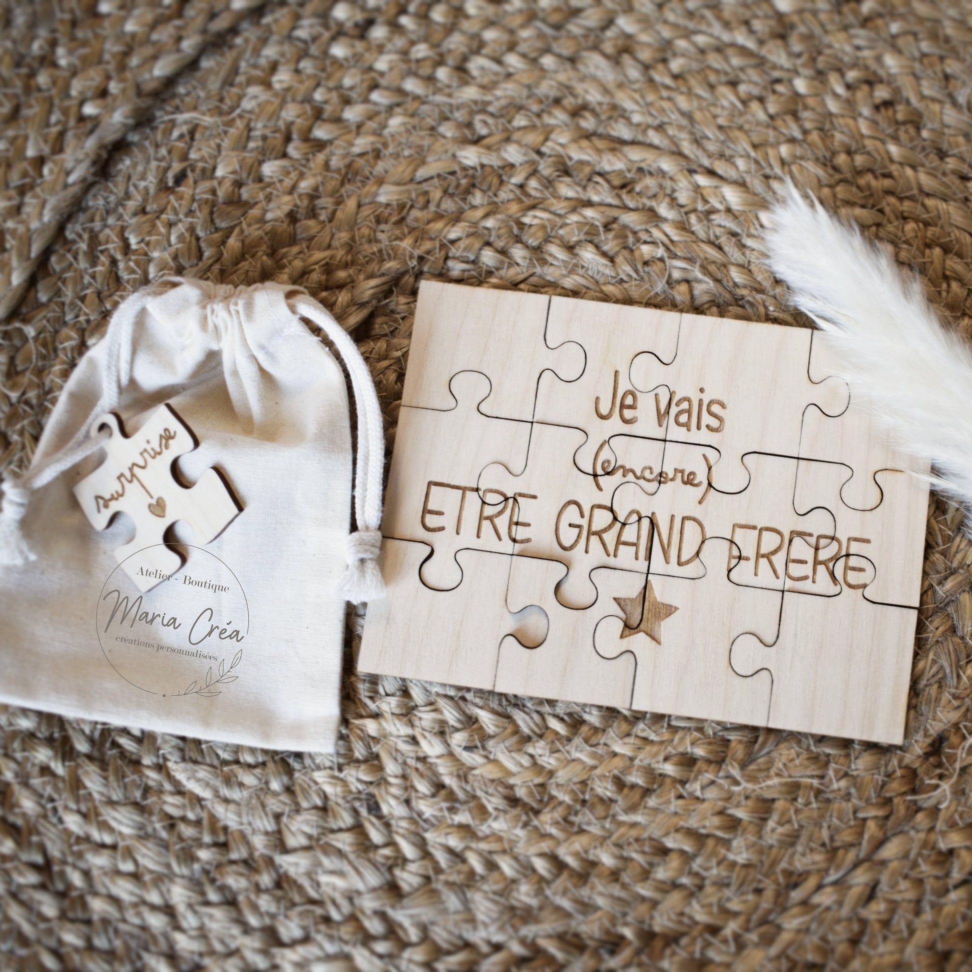 Une jolie annonce sous forme de puzzle pour un petit garçon qui sera grand frère pour la 2ème fois. Une façon originale de faire son annonce grossesse. Pochon en coton fourni pour y rager le puzzle.