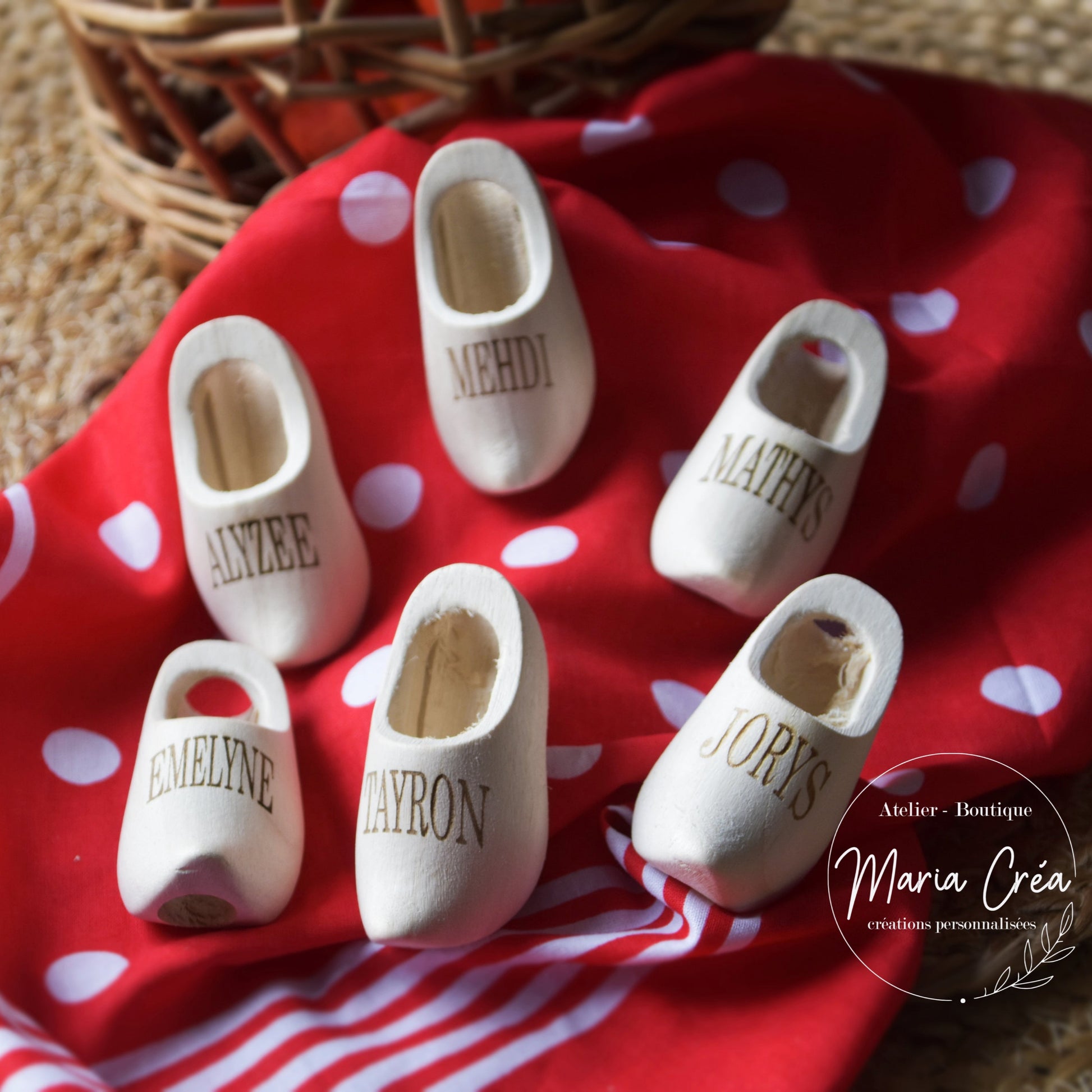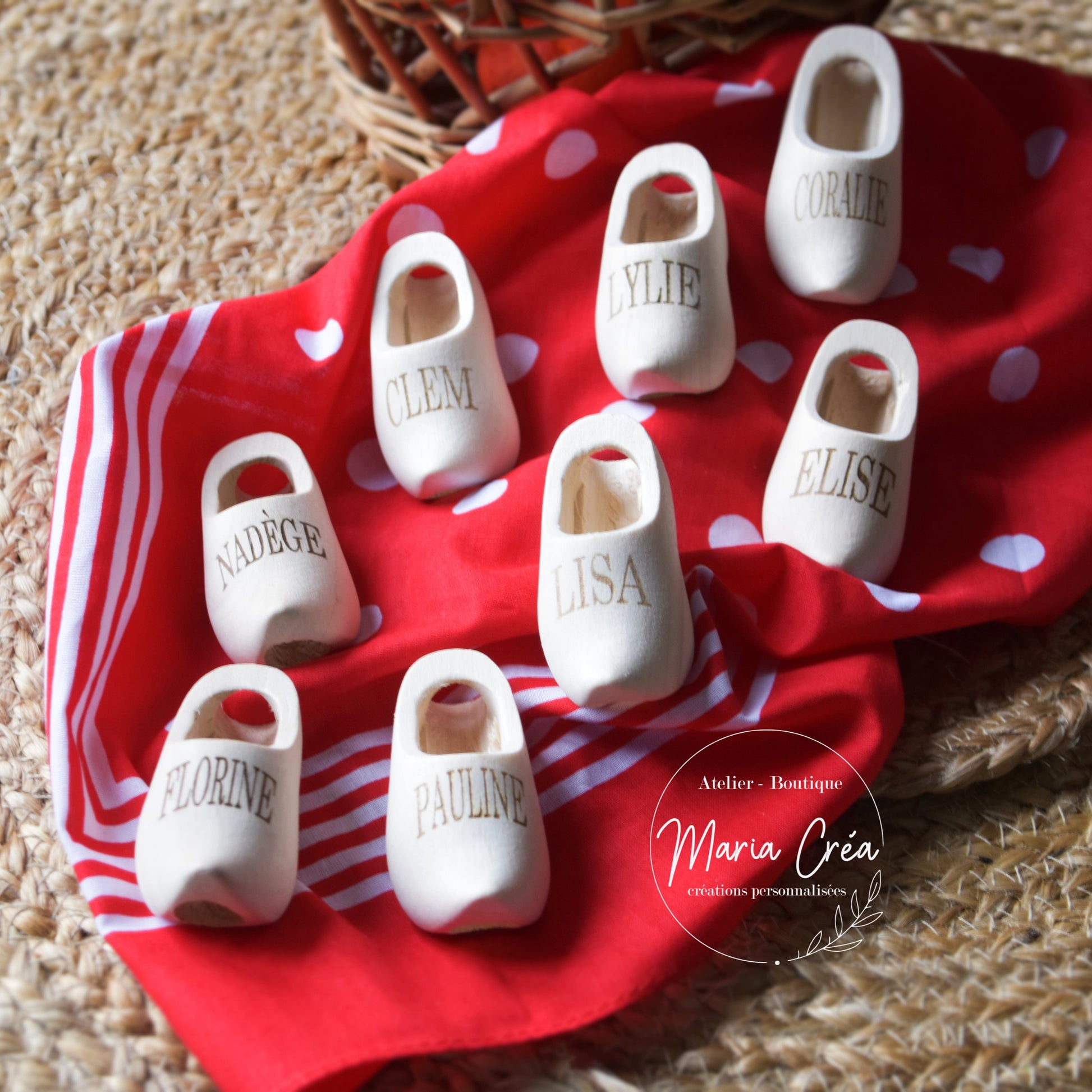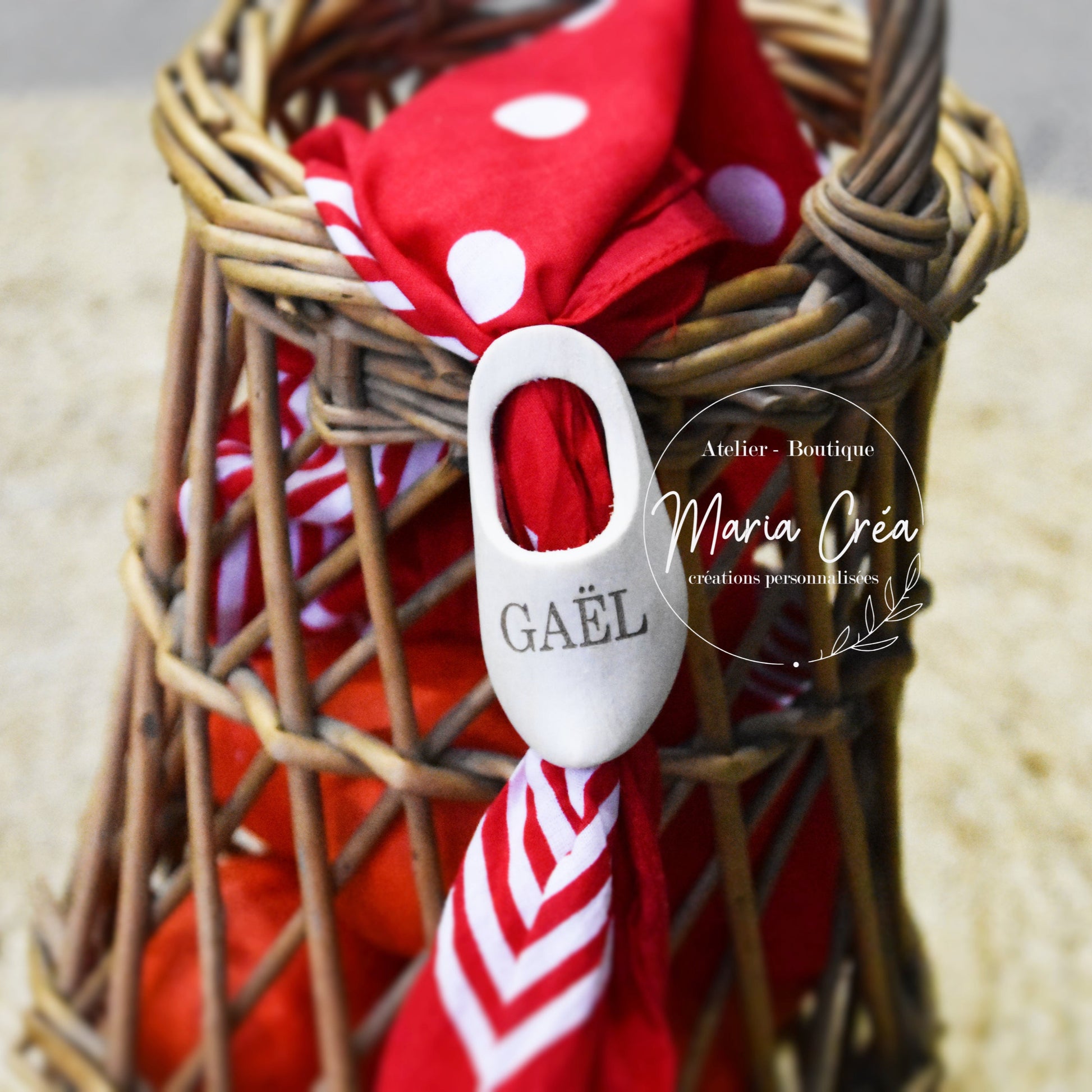 Petit sabot troué personnalisé avec un prénom pour y enfiler le foulard rouge
