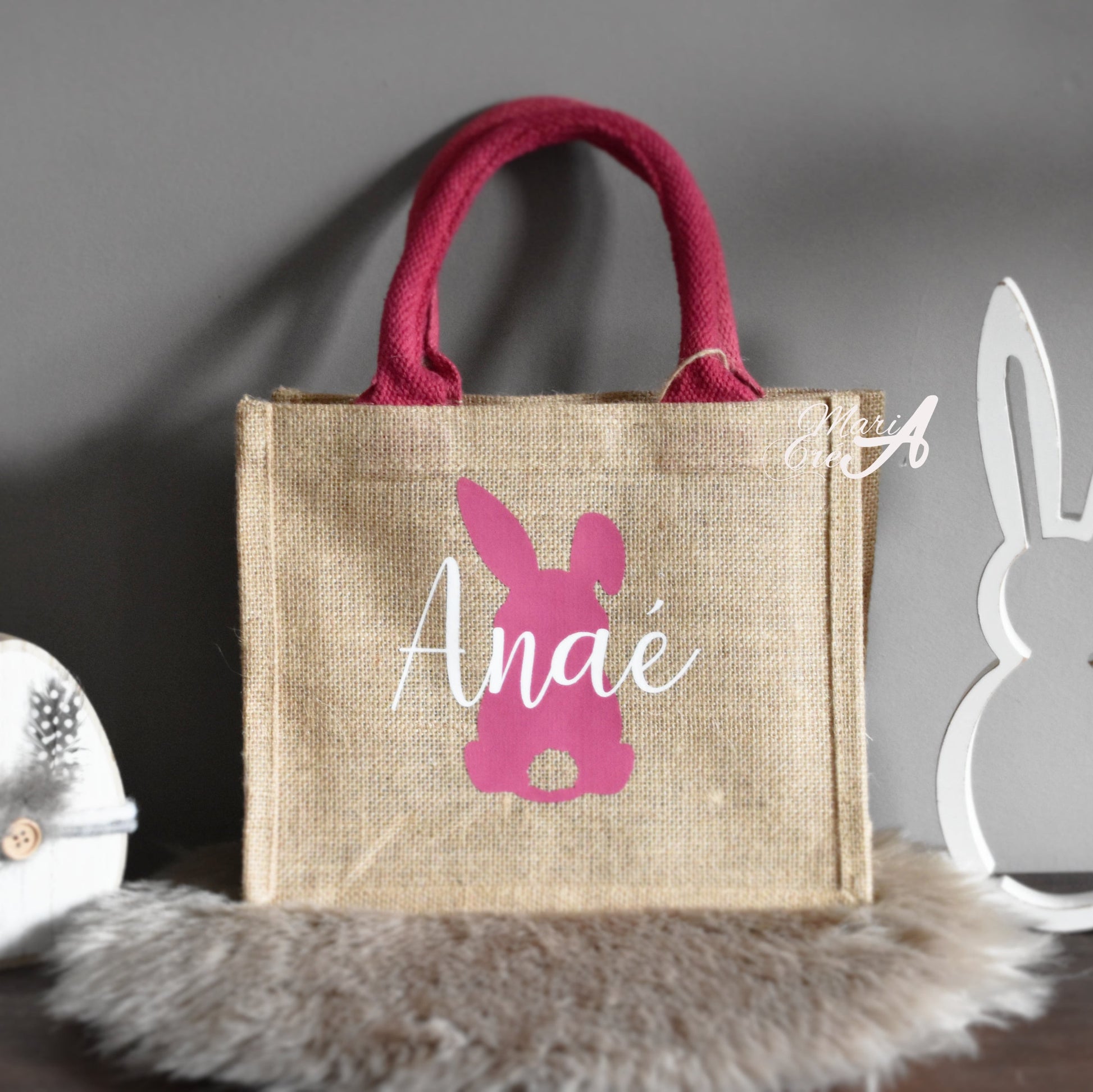 Offrez à votre enfant un sac unique pour une chasse aux œufs inoubliable ! Ce sac en toile de jute personnalisé est parfait pour ramasser les chocolats de Pâques avec style.