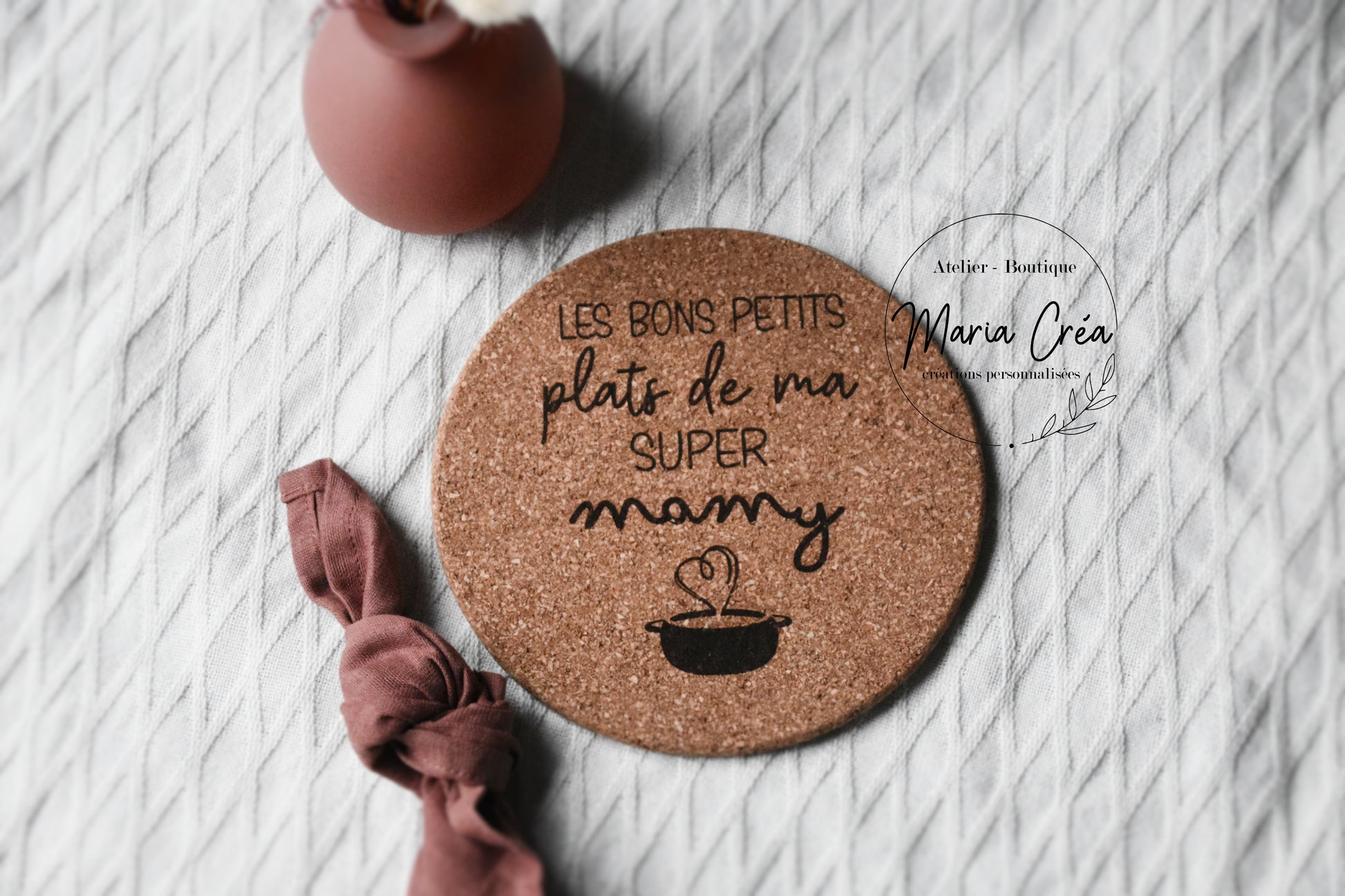 Offrez un cadeau aussi chaleureux que ses recettes ! Ce joli sous-plat en liège, gravé avec amour, trouvera parfaitement sa place dans la cuisine de votre maman adorée. Idéal pour la Fête des Mères, un anniversaire ou simplement pour lui dire merci.