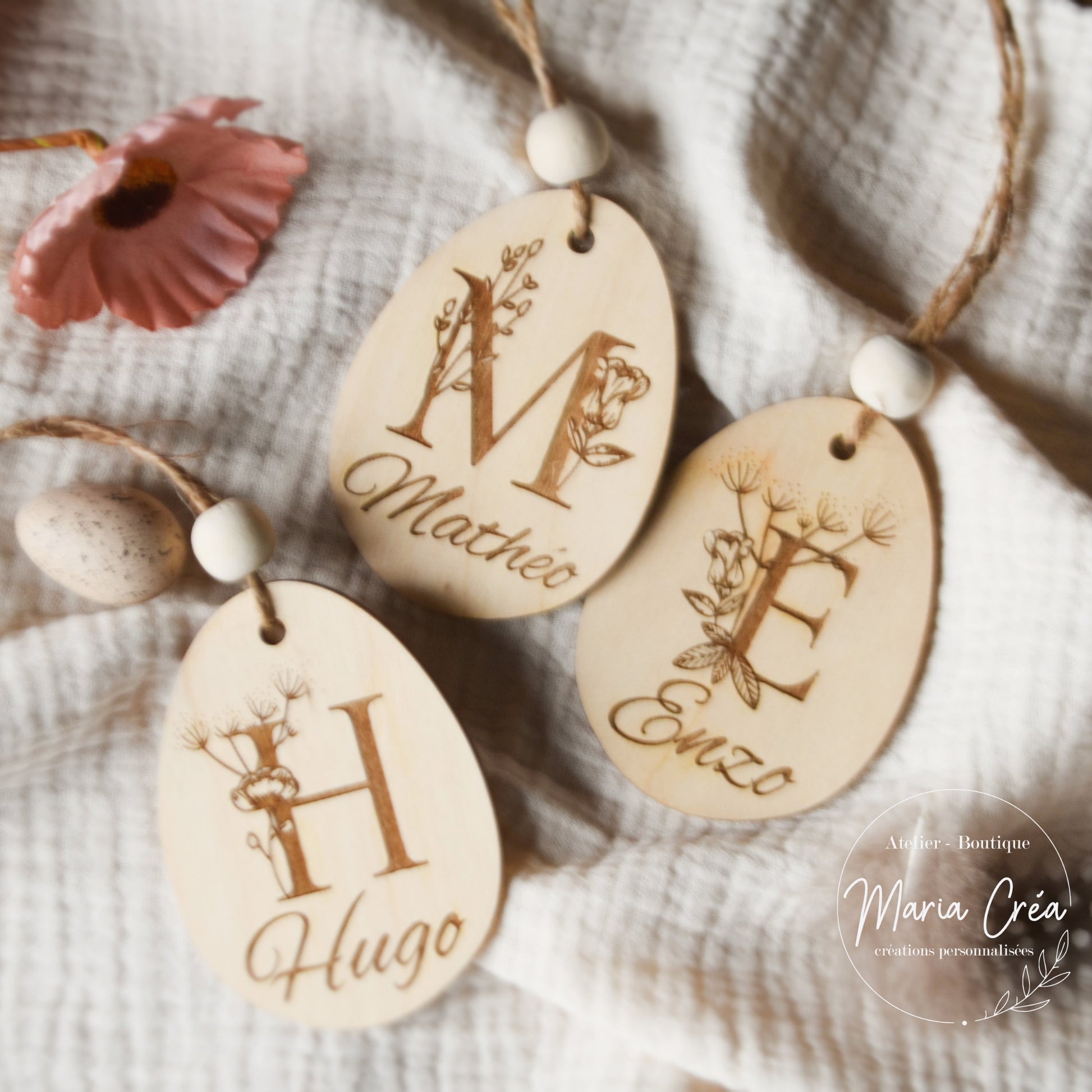 Ajoutez une touche naturelle et authentique à votre décoration de Pâques avec nos suspensions en bois en forme d'œuf personnalisées.