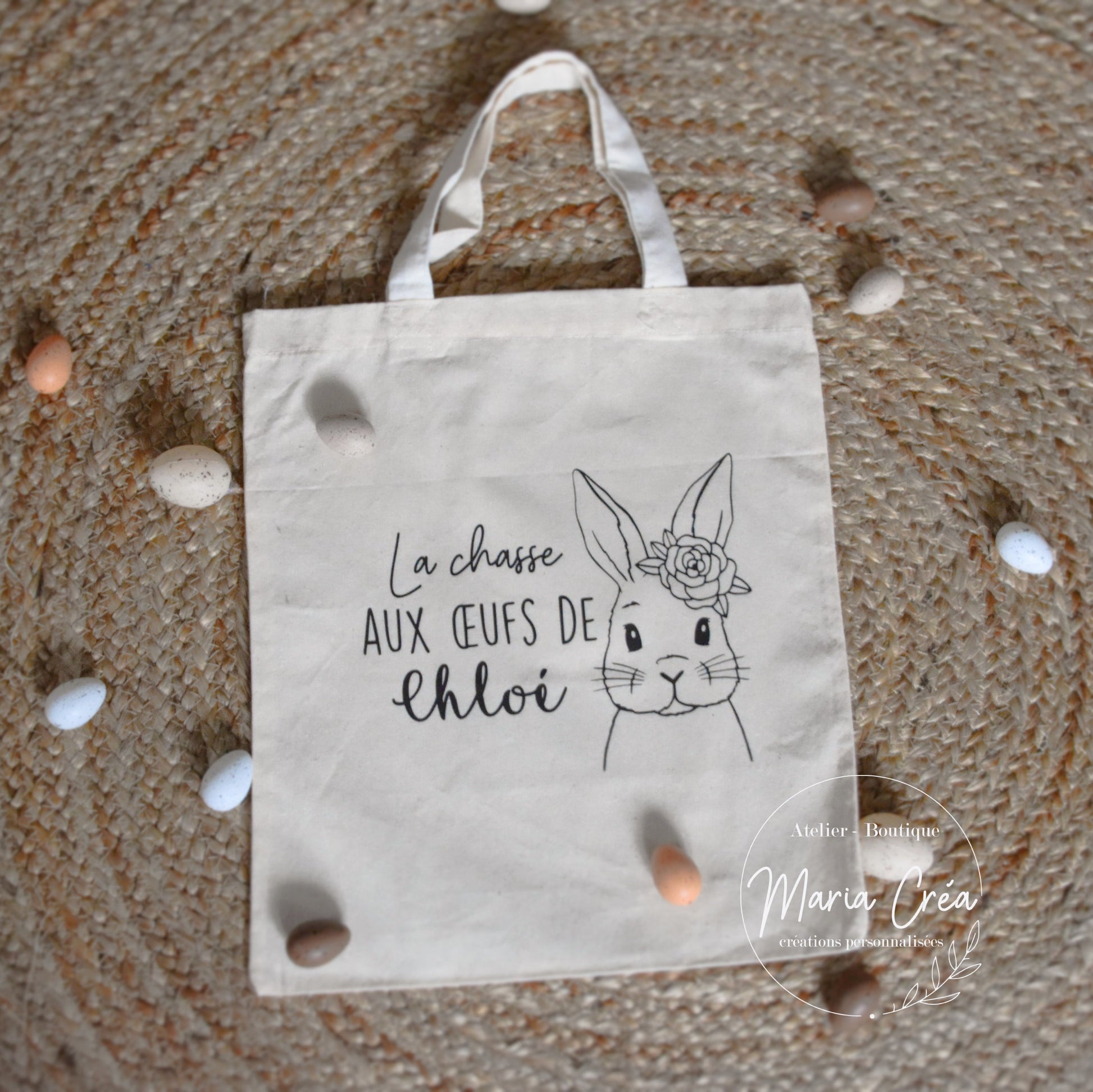 Nos sacs en coton sont une option écologique et réutilisable pour la chasse aux œufs de Pâques. Ils sont disponibles dans un modèle lapin fleuri ou sans fleurs, et personnalisés avec le nom de l'enfant pour une touche spéciale.